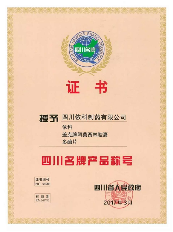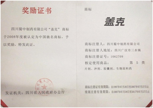 公司高度重视品牌战略,依法注册了“盖克”、“蜀中”、“三星堆”、“阿莫锋”、“益善源”、“蓉通”、“pg电子官网入口”等108件注册商标,1999年“盖克”、2003年“蜀中”、2007年“三星堆”被认定为德阳市知名商标,2001年“盖克”、2004年“蜀中”被认定为四川省著名商标, 2008年“盖克”商标被国家工商行政管理总局认定为“中国驰名商标”。2017年3月,公司盖克牌、pg电子官网入口牌阿莫西林胶囊和多酶片被四川省人民政府授予四川名牌产品称号。2016年,公司实现营业收入66373万元,利税7600万元;2017年,公司实现营业收入75045万元,利税7572万元。公司2017年被命名为德阳市第七批院士专家工作站,2016-2018连续三年被德阳市人民政府确定为重点龙头企业。